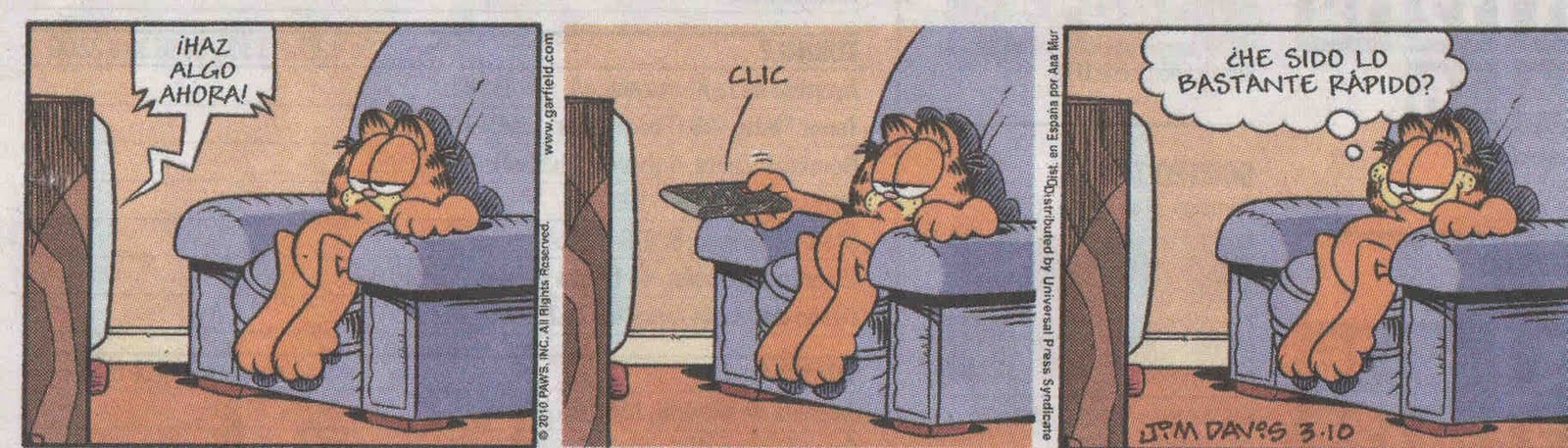 Muchas veces hemos comentado ya cómo detrás de sesudos análisis de sociólogos y comunicólogos para explicar el enganche ante la televisión, se nos habla del poder de la imagen. Se suelen olvidar de la debilidad del usuario y de la significativa (por insignificante) magnitud de un gesto. Jim Davis y su personaje, Garfield, lo tienen bastante más claro.