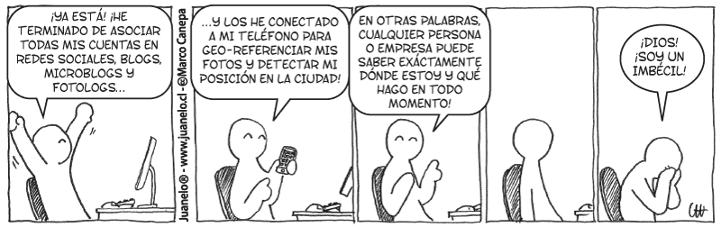 Lo cierto es que mi inteliencia no alcanza a entender el uso de estes redes (y no será por que no me lo hayan explicado mis hijos en repetidas ocasiones). Yo, con el correo electrónico, algún que otro chat y los blogs que me gustan voy más que servido.